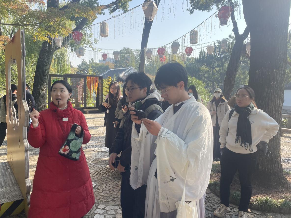 此外,讲解员还为大家详细讲述了园内古盘槐的历史渊源,带领大家参观了“鸳鸯戏莲”主题的非遗泥塑工艺作品,展示了园林装饰艺术与民间技艺的生动结合。同学们不仅细致品味了园林精巧自然的地理布局、叠山理水的设计技艺,以及竹、荷等植物营造的四季意境,还就园林背后所蕴含的“猗园”文化和文人精神进行了深入讨论。