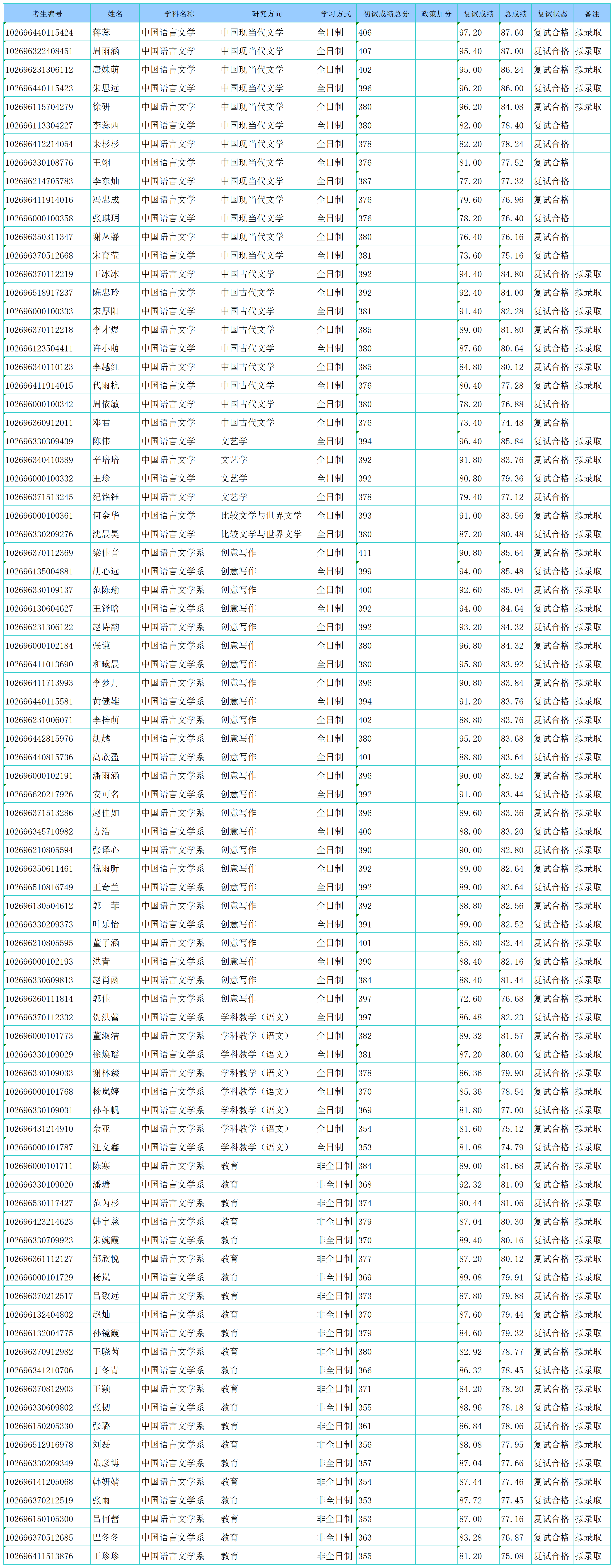 华东师范大学中国语言文学系2026年硕士研究生招生复试结果