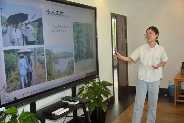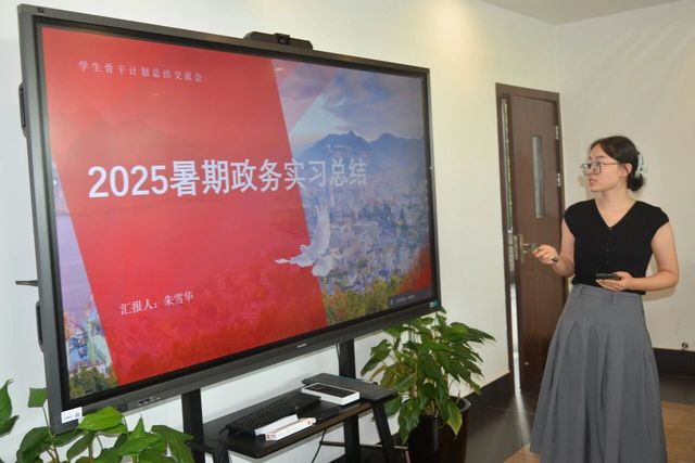 学生骨干培养计划成员代表陈倩、蔡蓥奥、杨雨绮、宋楚莹、朱雪华、巩成林、王欣雨、高畅、徐彧、许楚宜同学汇报暑期社会实践成果。他们奔赴祖国各地,在政务实践、支教推普、红色研学、志愿服务中挥洒汗水,展现中文系学子的风采。
